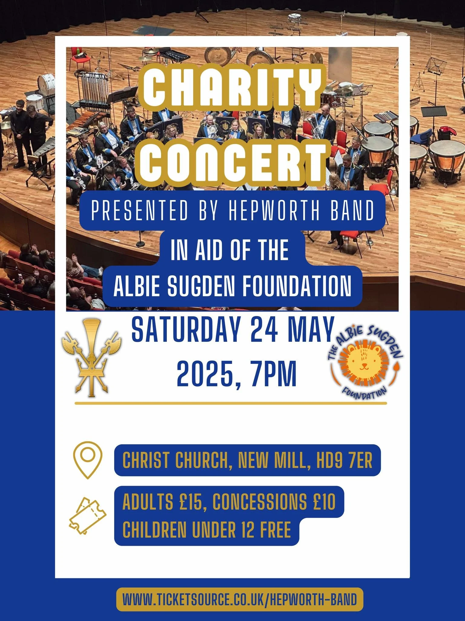 Hepworth Band is pleased to be teaming up with The Albie Sugden Foundation for a special charity concert at Christ Church, New Mill, Saturday 24 May 2025, 7pm.